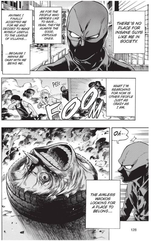The rest of the volume gets things back on track: the series’ villains return after their absence from the previous volume, most notably in a tense confrontation between All Might and an incarcerated All For One. However, I expect readers will be more captivated by a proper introduction to that Deadpool lookalike we’ve seen lurking around before: Twice, a criminal with the Quirk of cloning anything he touches. Horikoshi’s influence from American comics was obvious from day one, but while I can hardly recall a clear-cut example such as Twice, he’s the perfect example of careful inspiration in not outright copying: just like Deadpool, he’s clearly not all there, but his split personality disorder stems from a certain incident leaving him uncertain as to whether he’s the real Twice or a double — as seen above, he apparently made peace with his existential crisis, but various clues have us believing otherwise. Instead of rolling our eyes at a lazy copycat, we’re instead drawn deeper into My Hero Academia‘s world by wondering how this dilemma will eventually play a part.