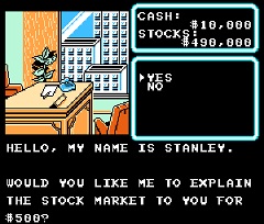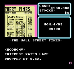 The graphics are passable, consisting mainly of blocky 8-bit portraits of your apartment and acquaintances. The gameplay revolves around taking your initial half a million dollars and turning it into enough cash to get all the things Bennie most desired. You do this by buying and selling stocks in blocks of 1,000, and the menu is thankfully intuitive and easy to use. It’d be better if you weren’t surrounded by people trying to rip you off.